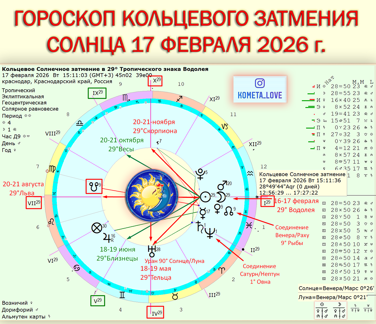 17 февраля 2026 г. произошло Кольцевое Затмение Солнца в 29°знака Водолея. Это затмение касается в первую очередь тех, у кого выражены последние градусы Зодиака - 29°знаков Водолей-Лев, Телец-Скорпион, Близнецы-Весы. Все, у кого в личном гороскопе - Солнце, Луна или главные углы гороскопа (ASC-МС), находятся в указанных зонах Знаков Зодиака, попадают в мощный резонанс с этим затмением, последствия которого могут проявляться в периоды летних и зимних затмений начиная с августа 2026 по февраль 2028 г. На гороскопе указаны главные даты рождения тех, у кого Солнце может попадать в мощный резонанс с этим затмением. 3 марта 2026 года нас ждет Полное затмение Луны в 13 градусе знака Девы, которое в первую очередь, затрагивает тех, кто родился в конце августа - начале сентября, в конце февраля-начале марта, в конце ноября-начале декабря, в конце мая - начале июня. А также, тех, у кого выражены первые половины знаков, ДЕВА-РЫБЫ-БЛИЗНЕЦЫ-СТРЕЛЕЦ. Прогнозы влияния Раху-Кету, в феврале-марте, касаются всех, у кого Солнце-Луна или ASC попали в указанные участки эклиптики (первые половины своих знаков) Подробный прогноз влияния Затмений - смотри подробнее в этой теме (выше по тексту).
