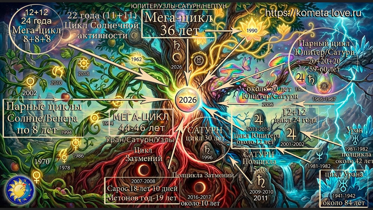 Планетарные циклы являются основой формирования прогнозов. Все наши события настоящего 2026 года, буквально сплетаются из накопленного опыта прошлых лет. Индивидуальный опыт наших личных событий и переживаний связан с циклами быстрых планет (Луна-Венера-Меркурий-Марс). Коллективный опыт - внешняя коллективная деятельность и социальная жизнь связана с циклами дальних планет. В этом видео мы рассмотрим примеры различных периодов прошлого - (временных пазлов), формирующих 2026 год, на примере прошлых событий в гороскопах известных людей и событий. Как говорил один известный человек - Будущее формируется из Прошлого и Настоящего.