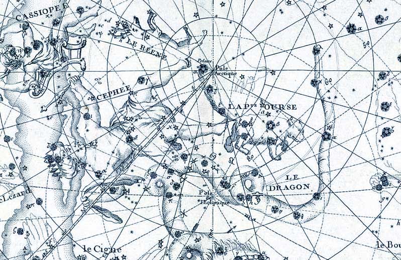 Фрагмент из звёздного атласа Celeste 1729_76 (автор английский астроном John Flamsteed's) Согласно поверьям многих народов, небо вращается вокруг своей оси - Полярной звезды, представляющей собой неподвижный центр неба, - прочность которой обеспечивает постоянство мирового круговращения. К примеру, у бурят Полярная звезда называется "Золотой кол" (Алтан гадас) и осмысливается то, как небесная коновязь, изготовленная девятью мудрыми кузнецами, то как камень, закрывающий отверстие в небе (если его вынуть, вода зальёт землю), то как вершина мирового столба или горы мировой, т.е. как "пуп неба". Согласно Птолемею, Полярная звезда обладает тем же астрологическим качеством, что и Сатурн и, в меньшей степени, Венера. По данным Девора, Полярная звезда указывает на слабость, болезни и неприятности, которые произойдут после получения наследства. Эбертин и Хофман находят у Полярной звезды природу Сатурна в сочетании с качествами Солнца и Венеры. Они отмечают, что при соответствующем положении в радиксе эта звезда даёт человеку духовную силу и авторитет, служит путеводителем и указателем. Если она соединяется с планетами в угловых домах гороскопа, человек будет обладать здравым смыслом и благоразумием, будет следовать своему инстинкту, "внутреннему голосу ". Он будет ясно понимать свои задачи, следовать по намеченному пути и достигнет цели. Ригор указывает, что Полярная звезда приносит нативу множество проблем, болезни, утраты в семье, любви и т.п. Человек всё время пытается продвинуться, выиграть; он не испытывает стыда, у него может быть возмутительный характер. Возможны скрытые заболевания, трагедии. Постоянное промедление в действиях представляет собой настоящее бедствие для некоторых их таких людей. Признание приходит поздно. При совпаде Полярной звезды с Солнцем человека ожидают постоянные повороты судьбы; высокое положение. При соединении Полярной звезды с Луной натив из-за неудовлетворённости собой в какой-то период жизни может принять решение или совершить поступок, который окажется губительным. Меркурий в совпаде с Полярной звездой делает рождённого остроумным, деятельным, оригинальным, способным справляться со сложными задачами, но также склонным к сомнительным поступкам. Соединение этой звезды с Венерой даёт склонность к одиночеству, есть опасность семейных осложнений и буйных проявлений. Люди с конъюнкцией Марса и Полярной звезды - хорошие руководители, они стремятся овладеть ситуацией, смелы, почти нахальны, могут совершать предосудительные действия при достижении своих целей. Совпадение Полярной звезды с Юпитером приносит высокое положение в церковных делах, спорте, в занятиях оккультизмом, общественной деятельности; натив может снискать почести. В авестийской традиции слугами Полярной звезды выступают Уран, Нептун и Луна (в некоторых источниках также Селена и Сатурн). Полярная звезда считается звездой первой астрологической величины. Она даёт изменчивость, непредсказуемость в характере, метания из стороны в сторону. Надеяться на нее нельзя, одному она даёт что-то хорошее, у другого отнимает. Полярная звезда указывает на слабость, упадочные настроения, меланхолию, болезни, часто нелады с родителями, изменчивый жизненный путь. Полярная звезда лишает человека уверенности в завтрашнем дне, делает события неопределенными - вс