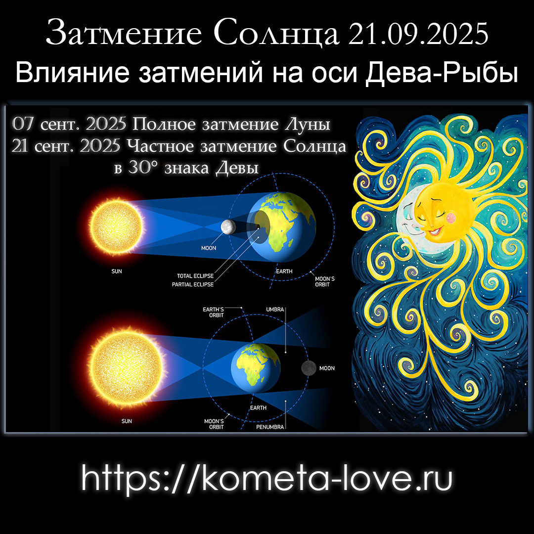 В период Солнечного Затмения 21 сентября 2025 года, акцентируется прогноз Влияния Кету. Но в целом, этот прогноз уже активировался со второй половины января 2025 г. и будет актуален до конца лета 2026 г. В сентябре 2025 года, произойдут два затмения, которые сильнее остальных затрагивают знаки Дева и Рыбы, а также же касаются знаков Близнецы и Стрелец. Начиная с 7 сентября после Лунного затмения, мы входим в напряженный период коридора затмений, который продолжится две недели между затмениями с 7 по 21 сент. 2025. Полное затмение Луны будет сегодня вечером, на оси 16 гр. Рыбы-Дева, 7 сентября в 21:11 мскв. Луна в момент затмения совпадает с Северным Лунным узлом (Раху) в знаке Рыбы. Поэтому, в этот период, надо особое внимание уделить прогнозам где указано влияние Раху! Частное затмение Солнца произойдет в 30-ом градусе знака Девы, 21 сентября 2025 г. в 22:41 мскв. Это затмение затрагивает ось равноденствий и может пошатнуть баланс сил в природе, политике, экономике, в отношениях между странами и людьми. Есть высокая вероятность, что во второй половине сентября и октябре 2025 года, нас ожидает грандиозный финансовый коллапс, и обрушение мировых рынков. Так же повышается вероятность новой военной эскалации, особенно на Ближнем Востоке, повторение конфликта Ирана с Израилем и возможно обострение вокруг Тайваня. Также сохраняется угроза новых мощных землетрясений и больших цунами во второй половине сентября 2025 г.